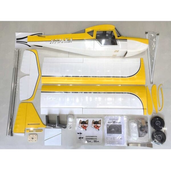 Gelbe Variante des STOL-Flugzeugs mit 2540mm Spannweite, grossen Ballonrädern und aufklappbaren Türen für unbefestigtes Gelände.
